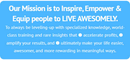 Our goal is to be here with you, helping you continue to level up your game with expert knowledge, world-class training, and rare guidance to accelerate your profits, boost your results, and ultimately make your life easier, awesomer, and more rewarding in truly meaningful ways.
