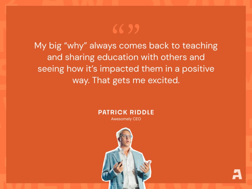 Awesomely: Ok, at the end of all of Awesomely’s intro kickstart videos in our training programs we create with REI partners, we always ask the same important question: “What’s your why?” Now, as you know Patrick, what we’re asking is why you’ve chosen to be an entrepreneur. And, the answer can’t be because of the money. The money is the thing that gets you to the why. So, what is the fuel that makes you want to continue being an entrepreneur who’s committed to the journey that you’re on?